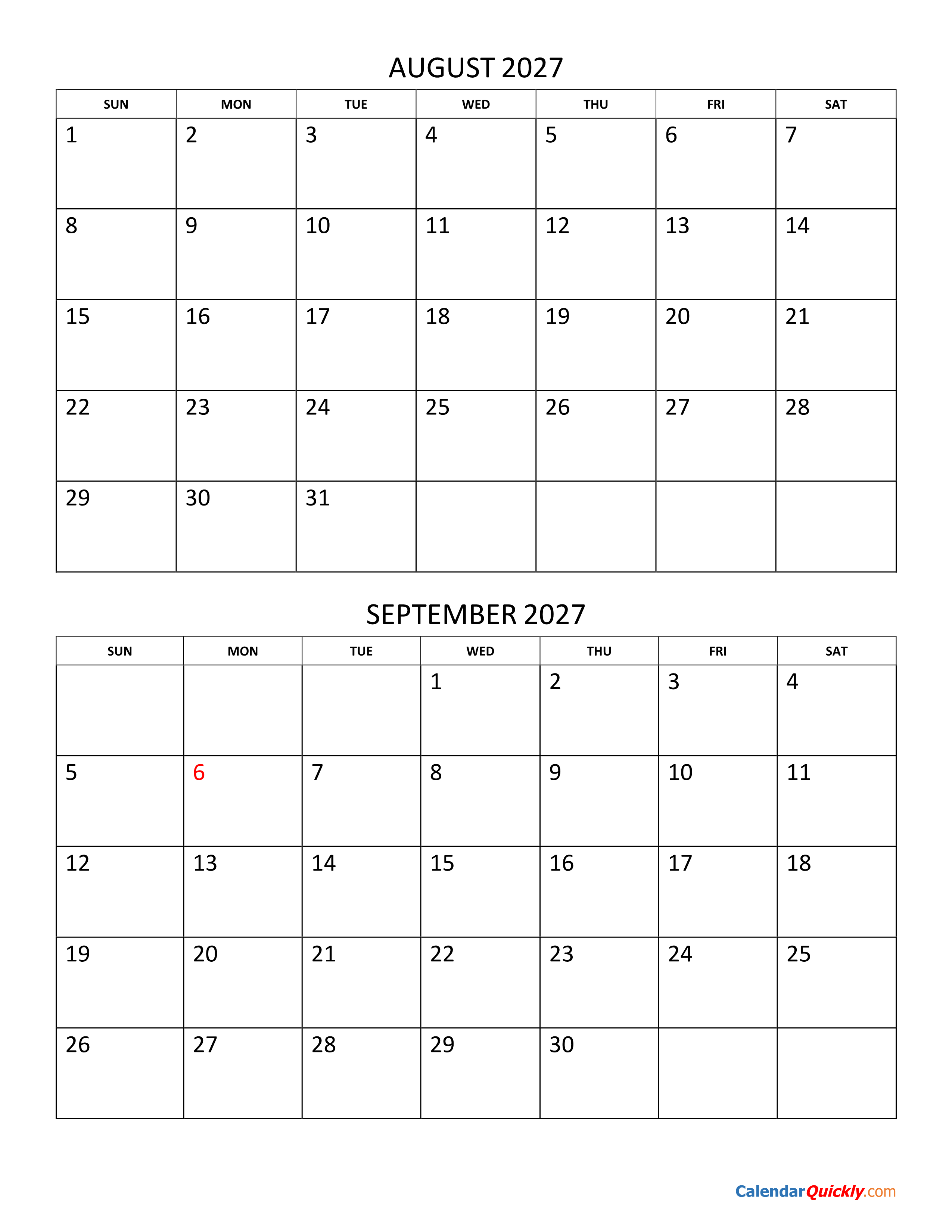 August and September 2027 Calendar. Printable two months calendar on single page, available to download for free as PDF files.