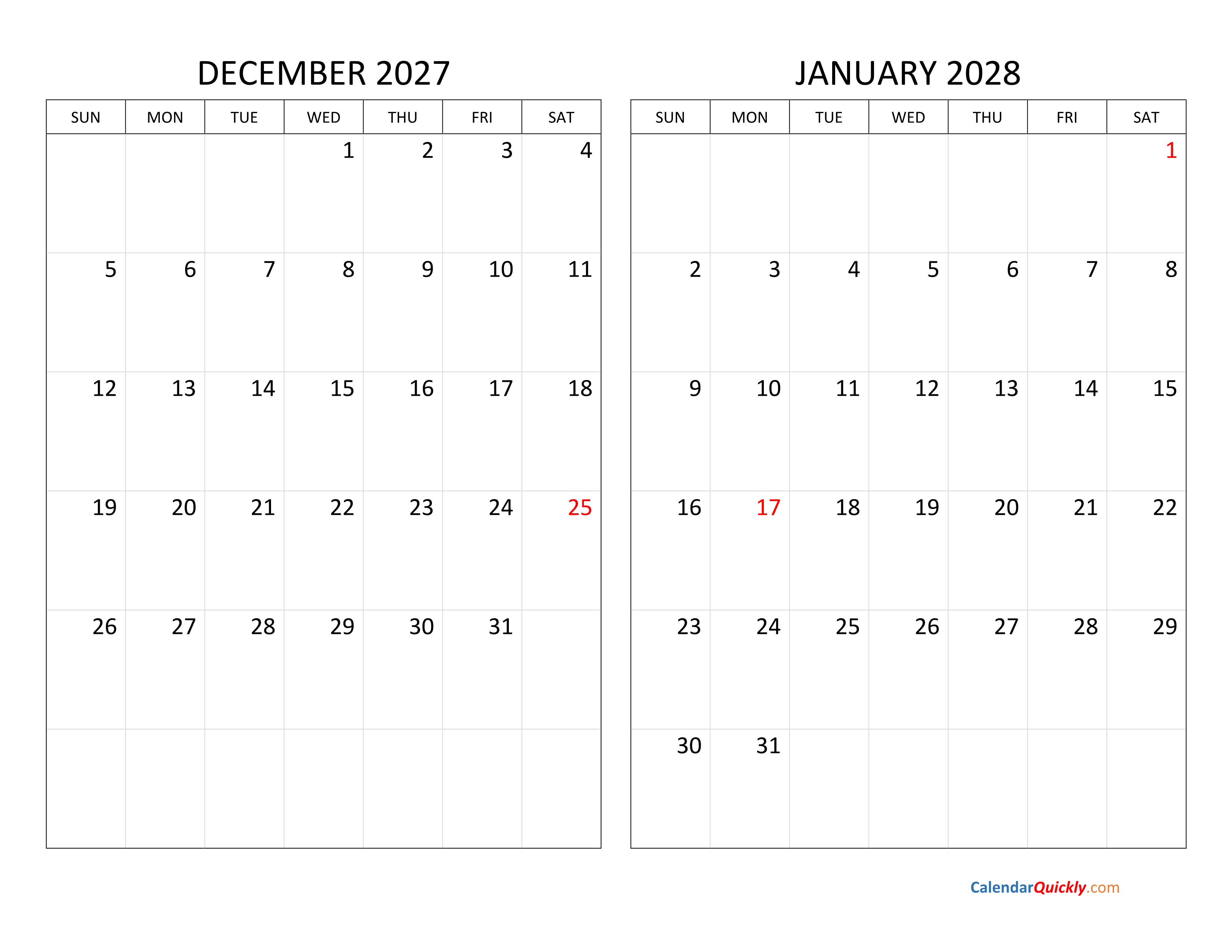Print December 2027 and January 2028 Calendar Horizontal PDF