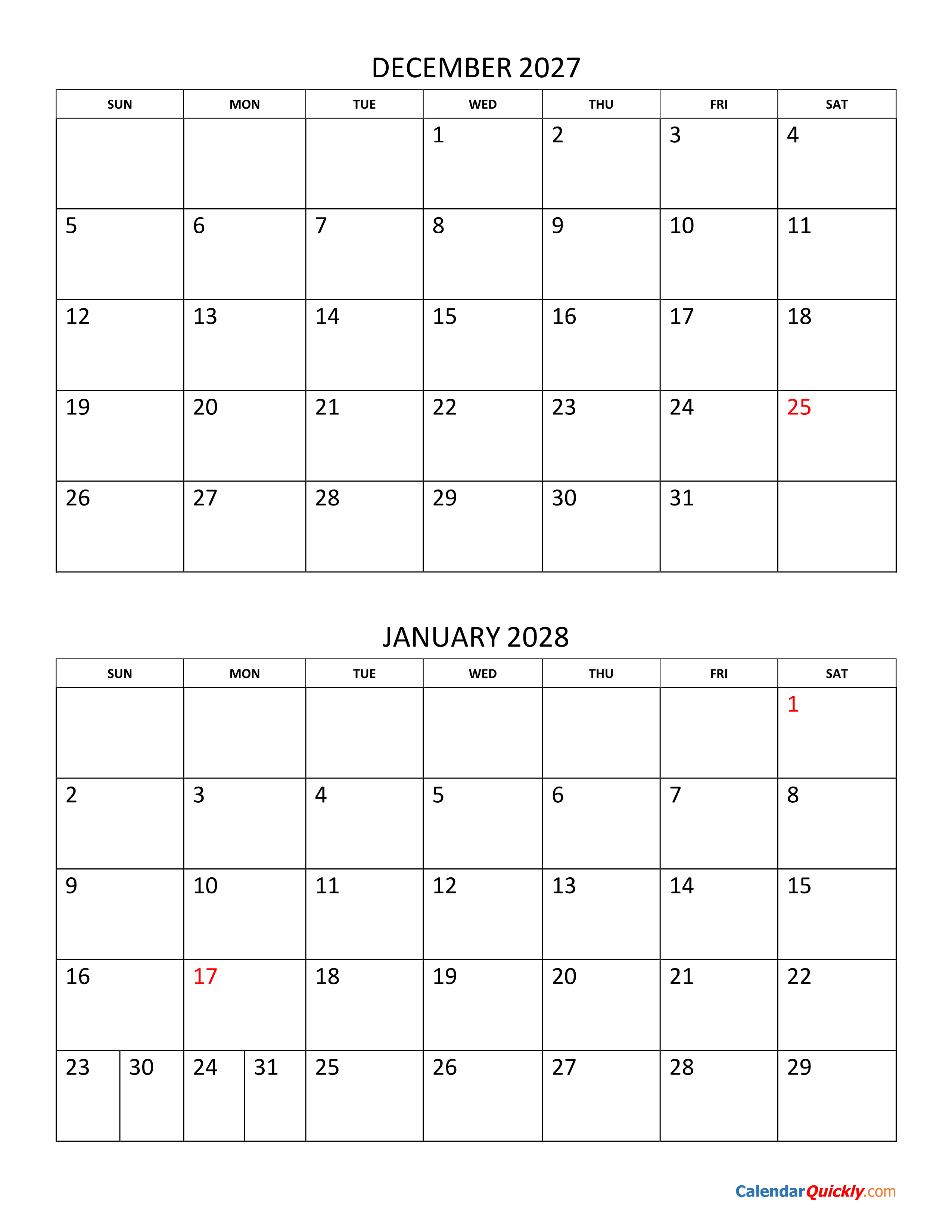 Print December 2027 and January 2028 Calendar Vertical PDF