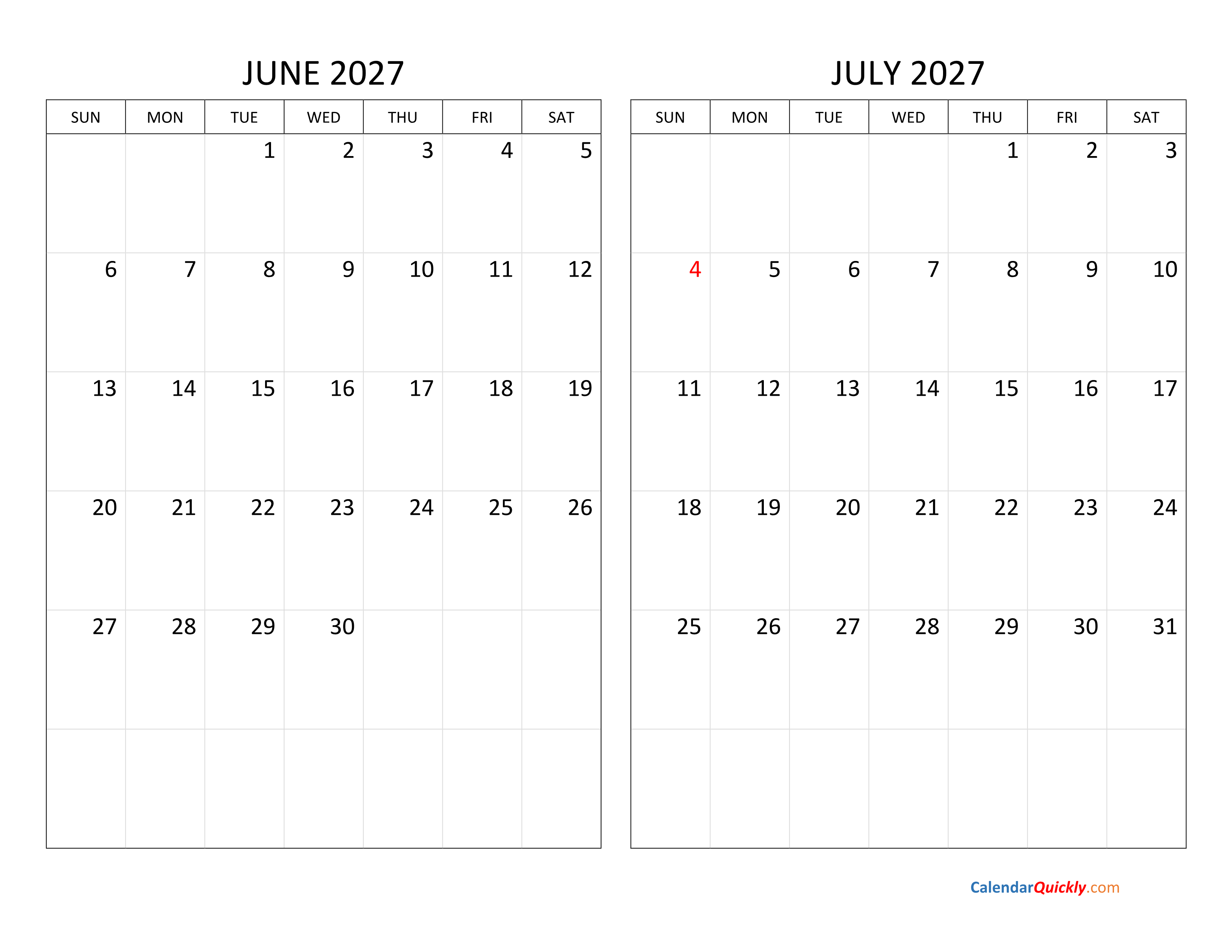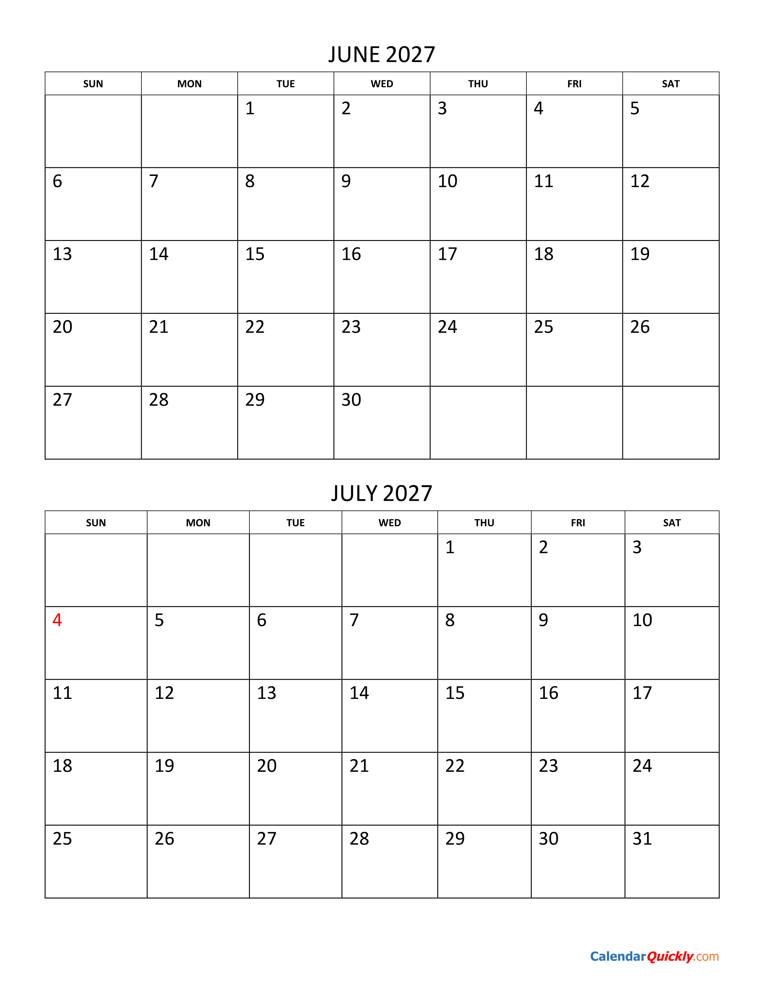 Print June and July 2027 Calendar Vertical PDF