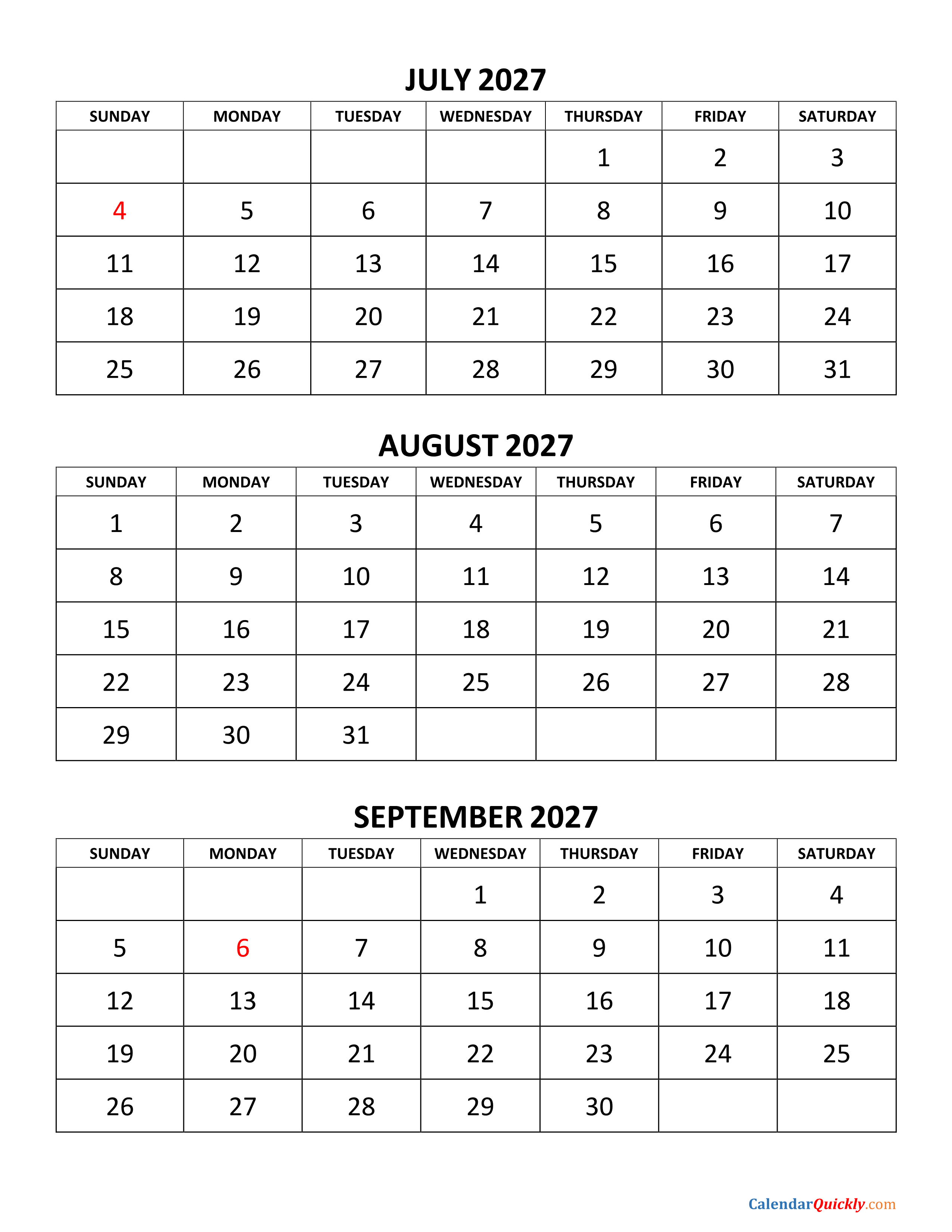 July to September 2027 Calendar. Printable three months calendar July, August and September 2027 calendar on single page, available to download for free as PDF files.