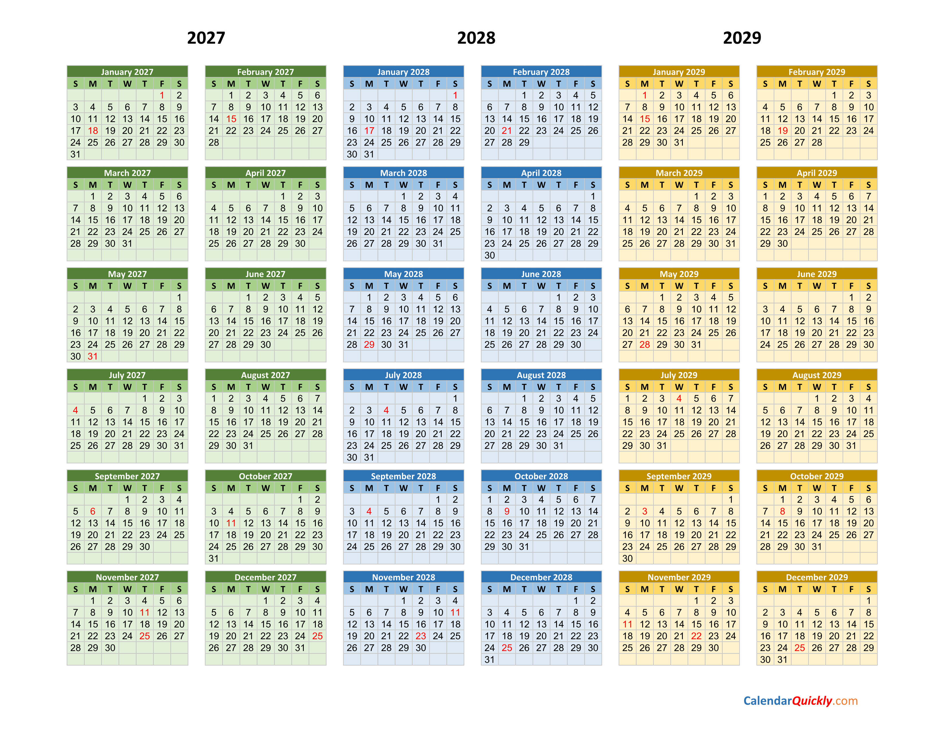 2027-2028-2029 3-year calendars designed on one page. You can have a comprehensive view of the date and month of the three years from 2027 to 2029. Three years are designed contiguous, each year consists of 2 columns and 6 rows.