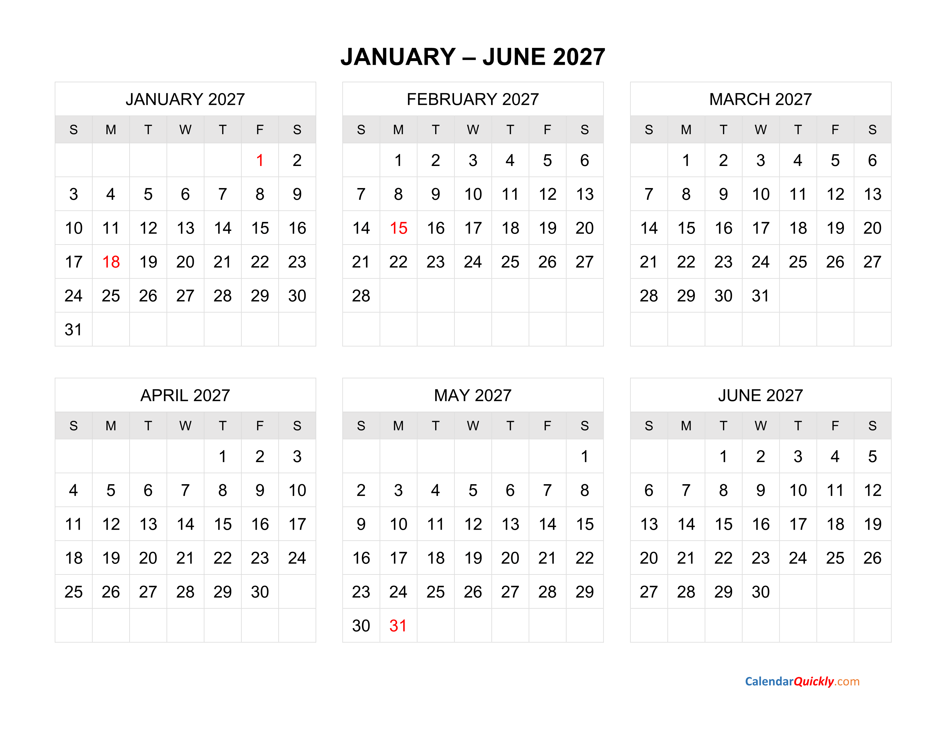 You can find here calendar templates for january to june 2027 calendar printed on one page horizontal. Dividing the calendar page into the first half of the year makes it more convenient for your business.