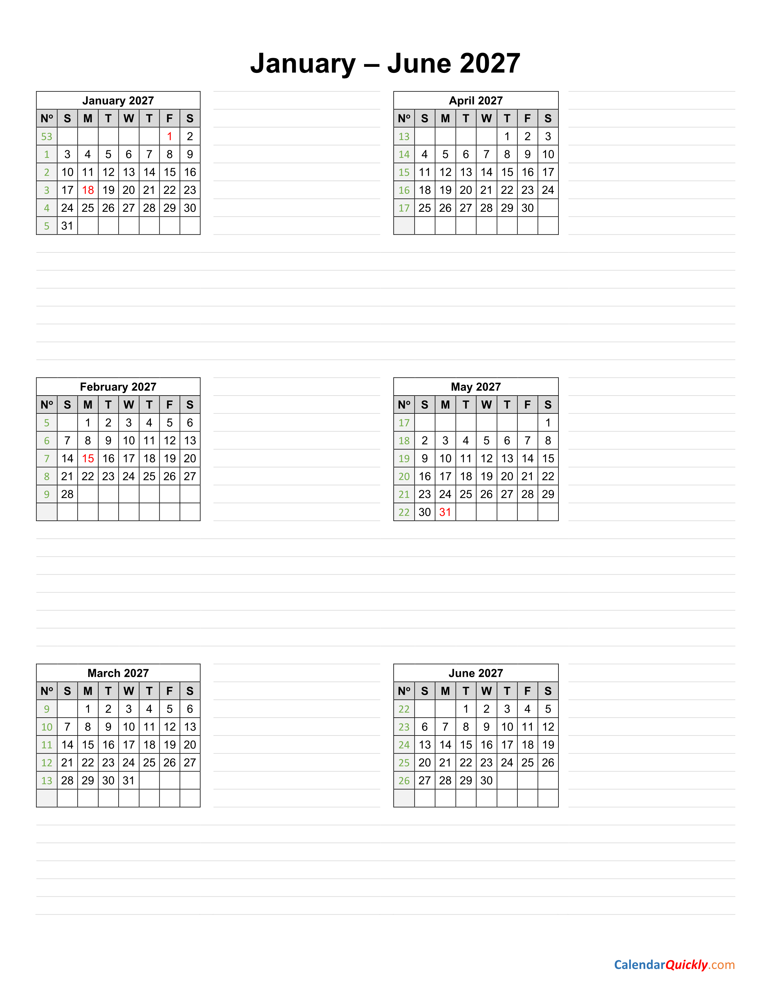 A six months calendar 2027 is a calendar template designed with two periods of six months existing in a year. You can find here calendar templates for each half year, six months 2027 calendar printed on one page. Dividing the calendar page into the first half of the year and the second half of the year makes it more convenient for your business. The calendar is arranged on the first page for months from january to june and on the second page for the remaining months.