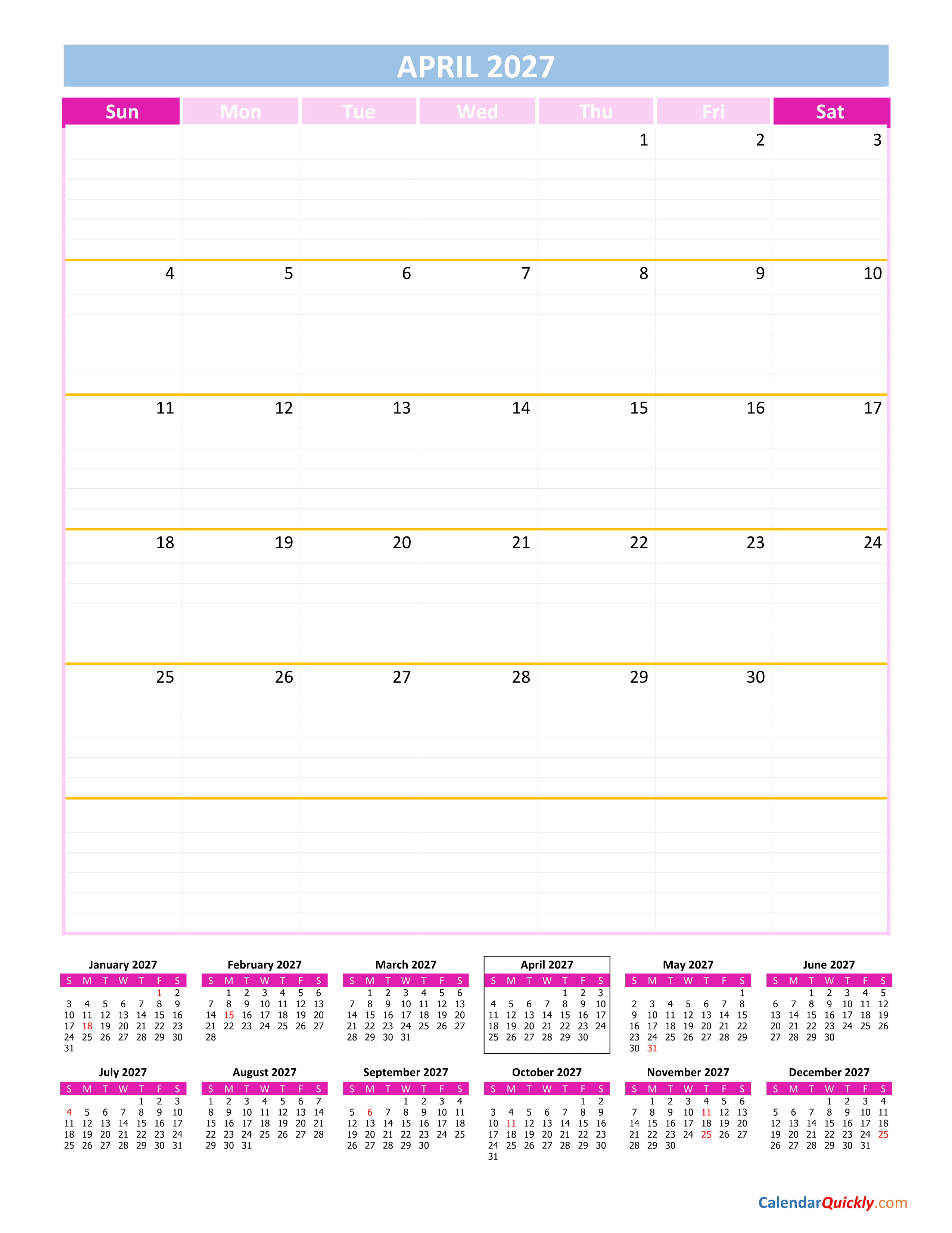 April calendar 2027 is designed in vertical format with many colors. In particular, the footer section has a full 12-month calendar of the year 2027 so you can see the entire day and month of the year. The indispensable part is the space in each day to take notes.