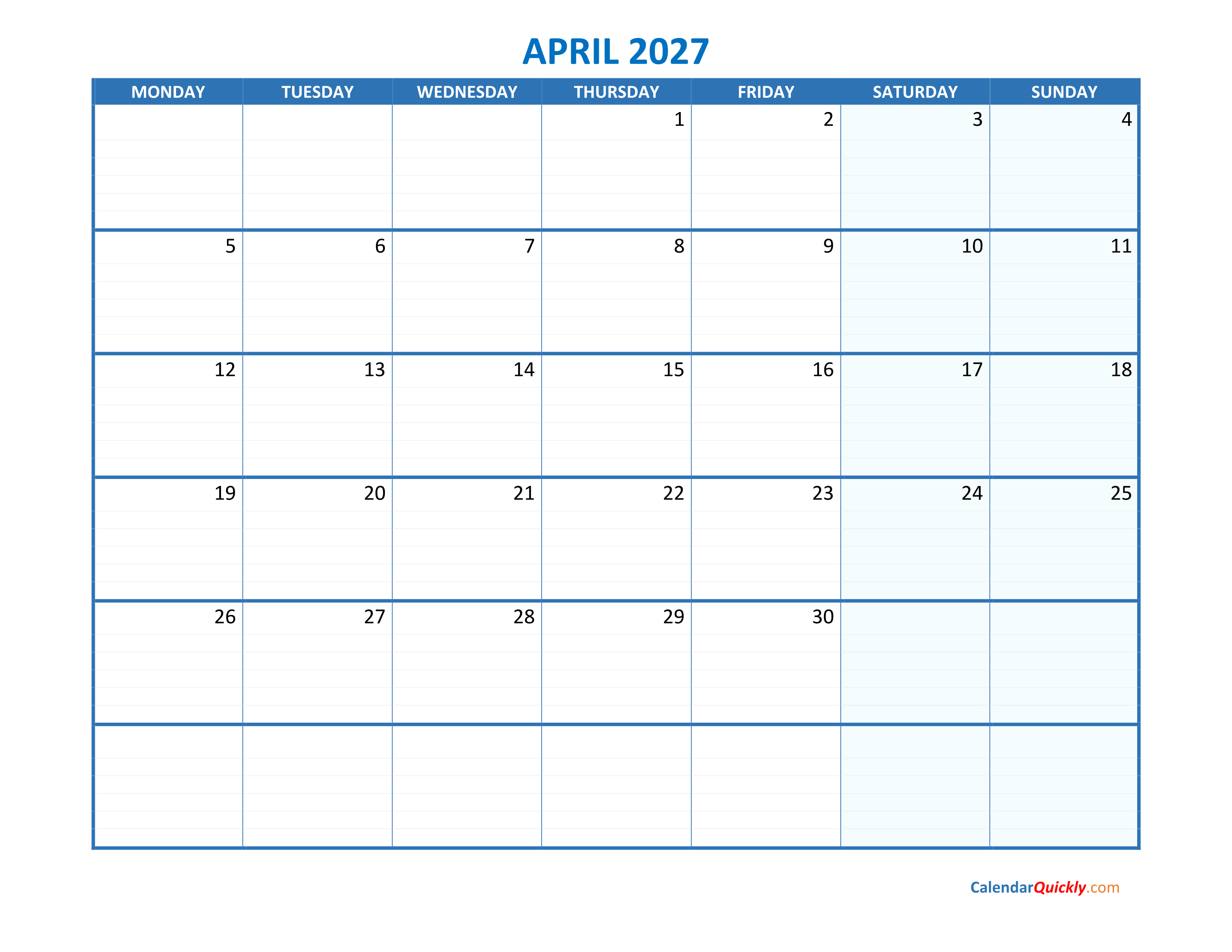 April monday 2027 blank calendar is a design calendar template with the week starts on Monday. Using good-looking light blue, the weekend is marked for easy identification. Use small fonts and leave plenty of space for notes.