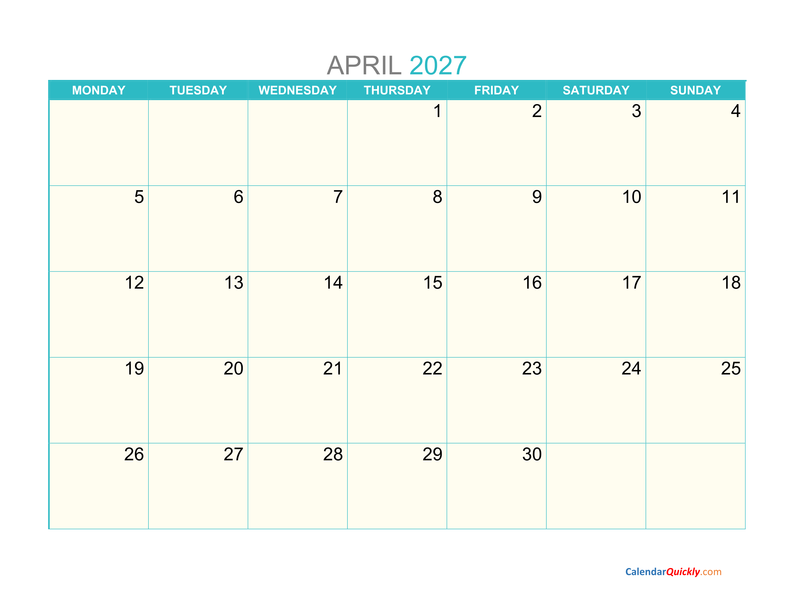 April monday 2027 calendar printable in pale yellow and blue colors makes the calendar page stand out more. US federal holidays are marked in red so it is easy to recognize the appropriate plans. The calendar template is provided for free in PDF format, you can easily download and print.