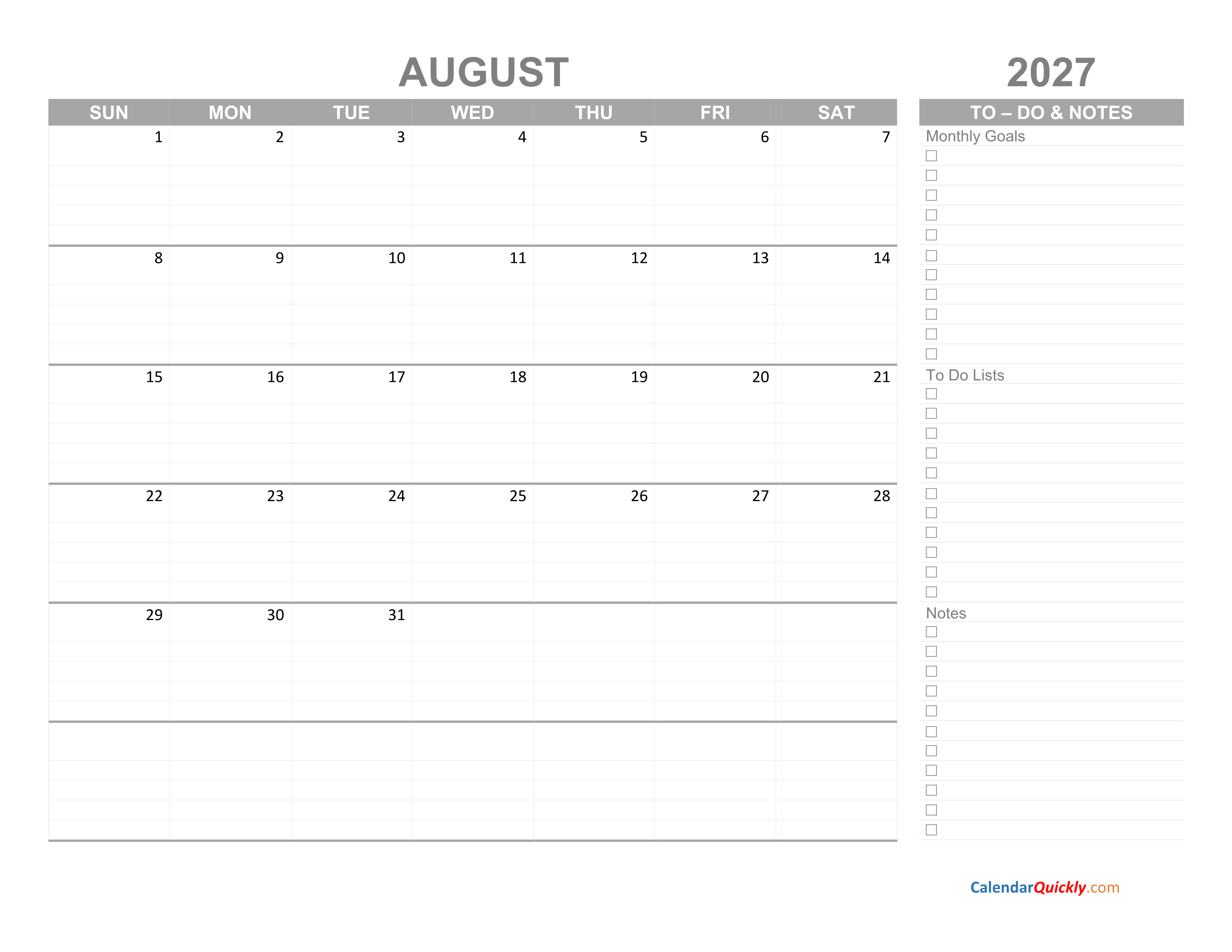 August 2027 calendar with To-Do List is designed with a large right-hand space to note contents such as Monthly Goals, To-Do Lists, Notes. The calendar is simply designed to suit different work needs. All you need to do is download this printable calendar as PDF file and print it.