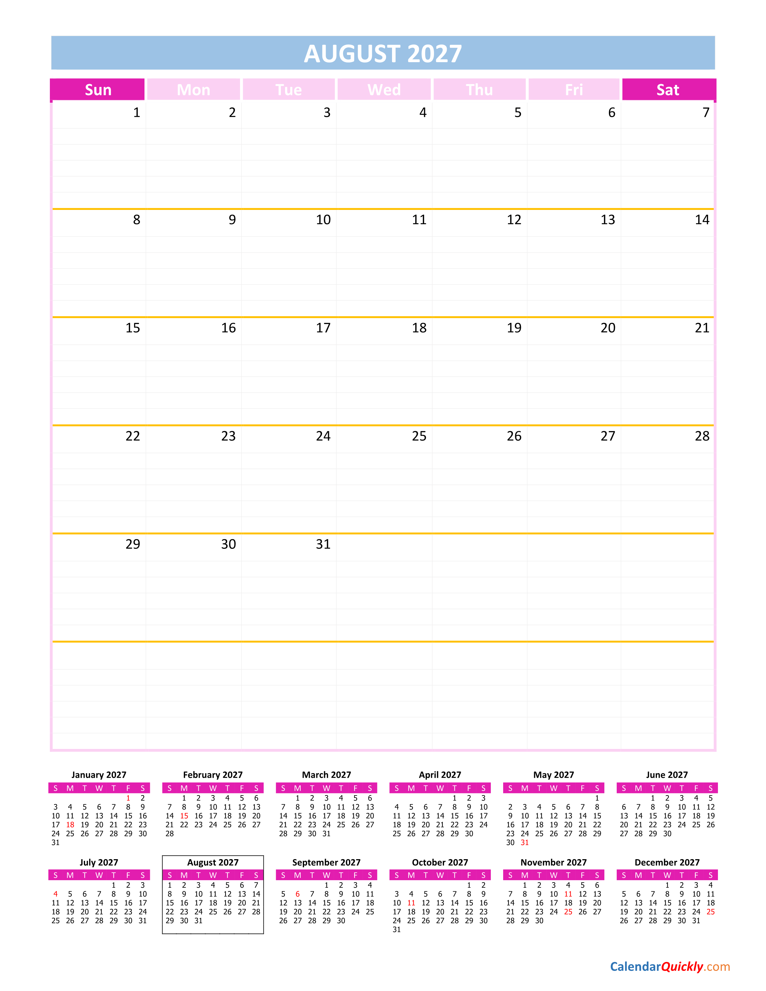 August calendar 2027 is designed in vertical format with many colors. In particular, the footer section has a full 12-month calendar of the year 2027 so you can see the entire day and month of the year. The indispensable part is the space in each day to take notes.