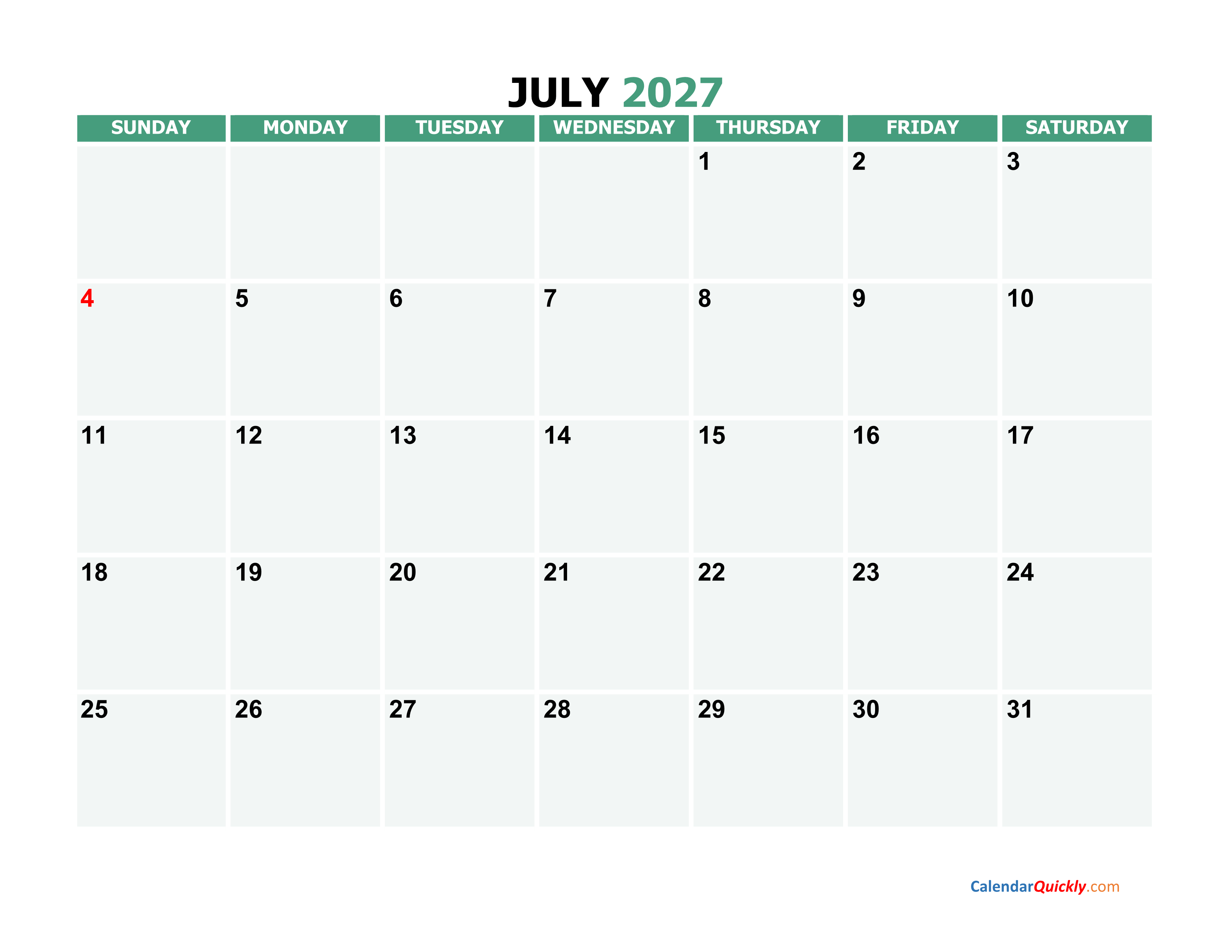 Print July 2027 Calendar PDF
