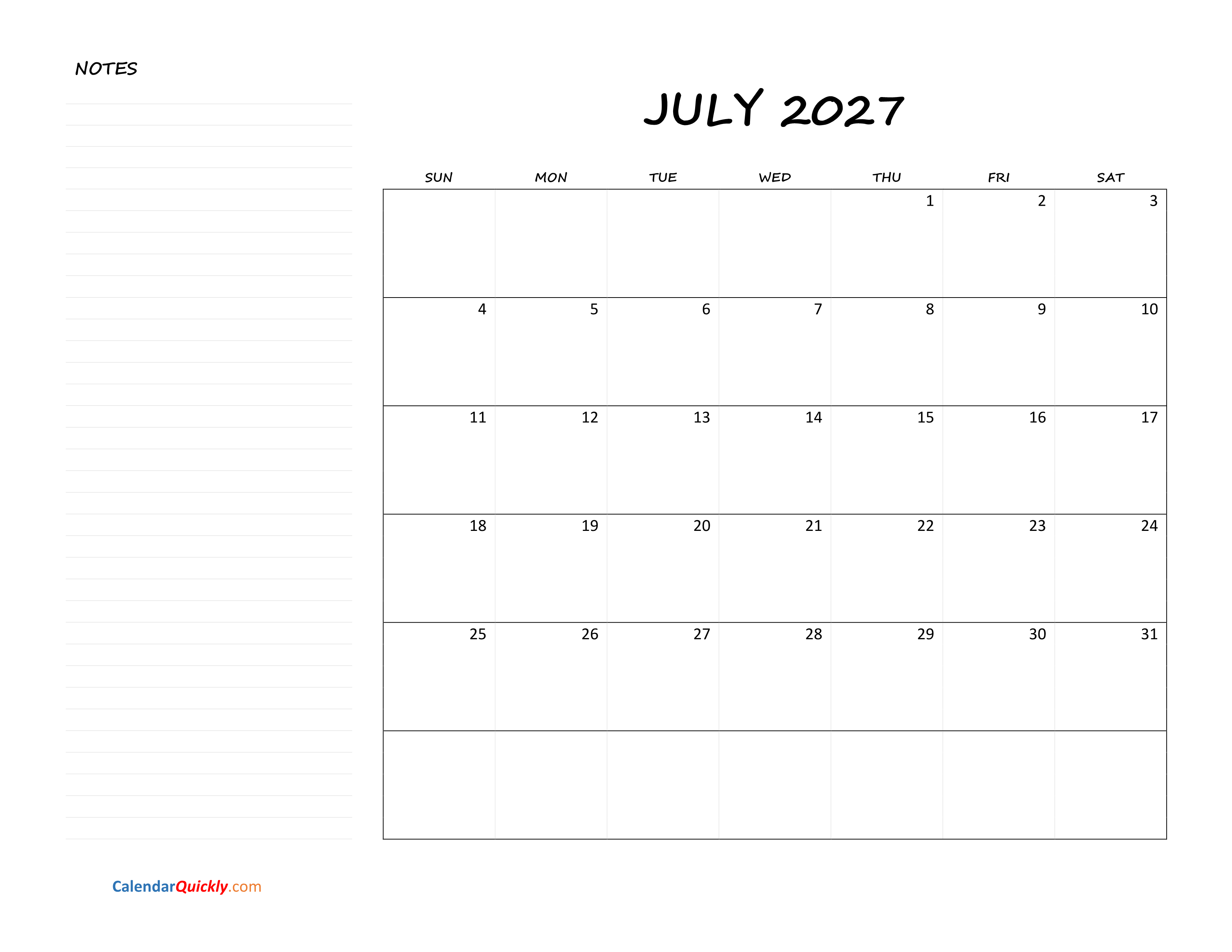July Blank Calendar 2027 with Notes