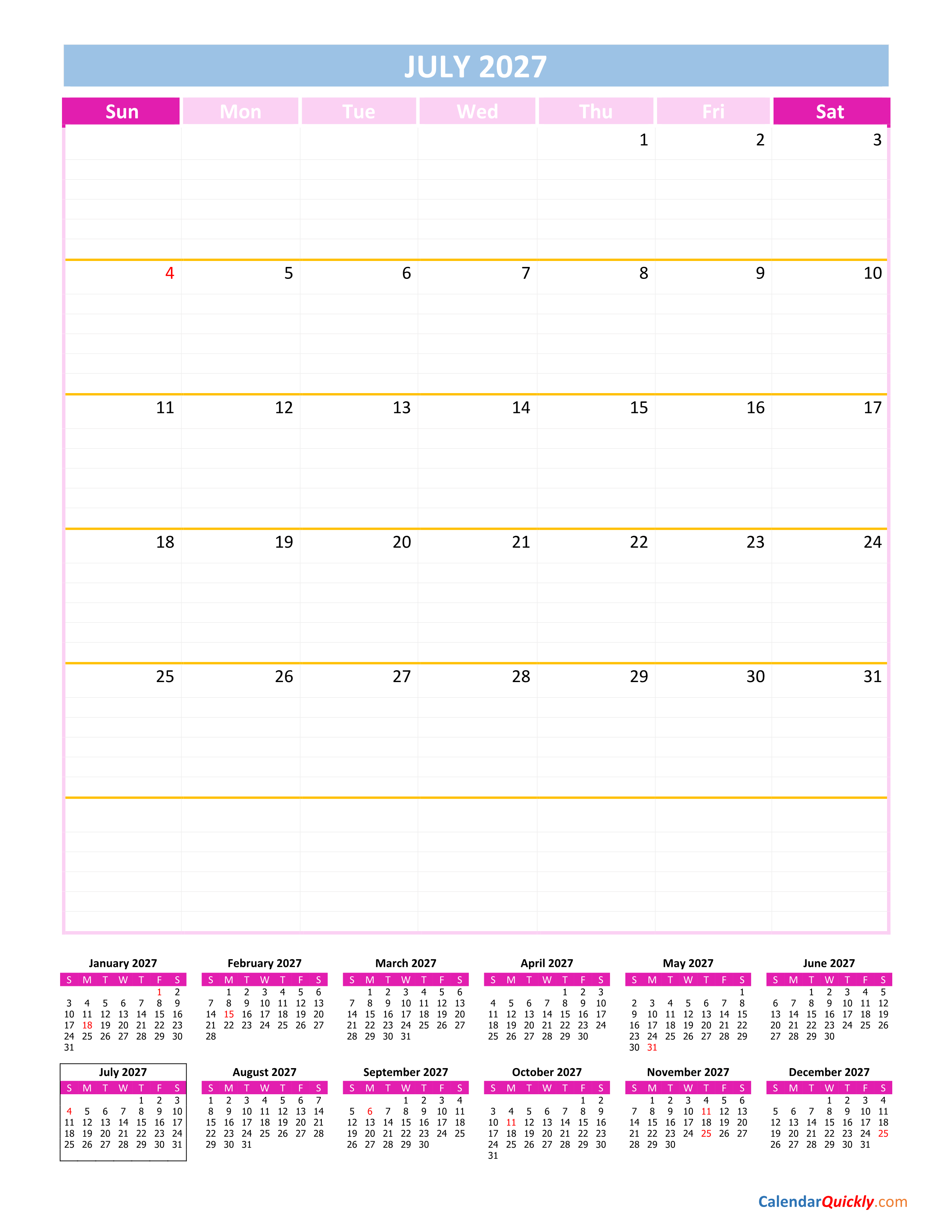 July calendar 2027 is designed in vertical format with many colors. In particular, the footer section has a full 12-month calendar of the year 2027 so you can see the entire day and month of the year. The indispensable part is the space in each day to take notes.