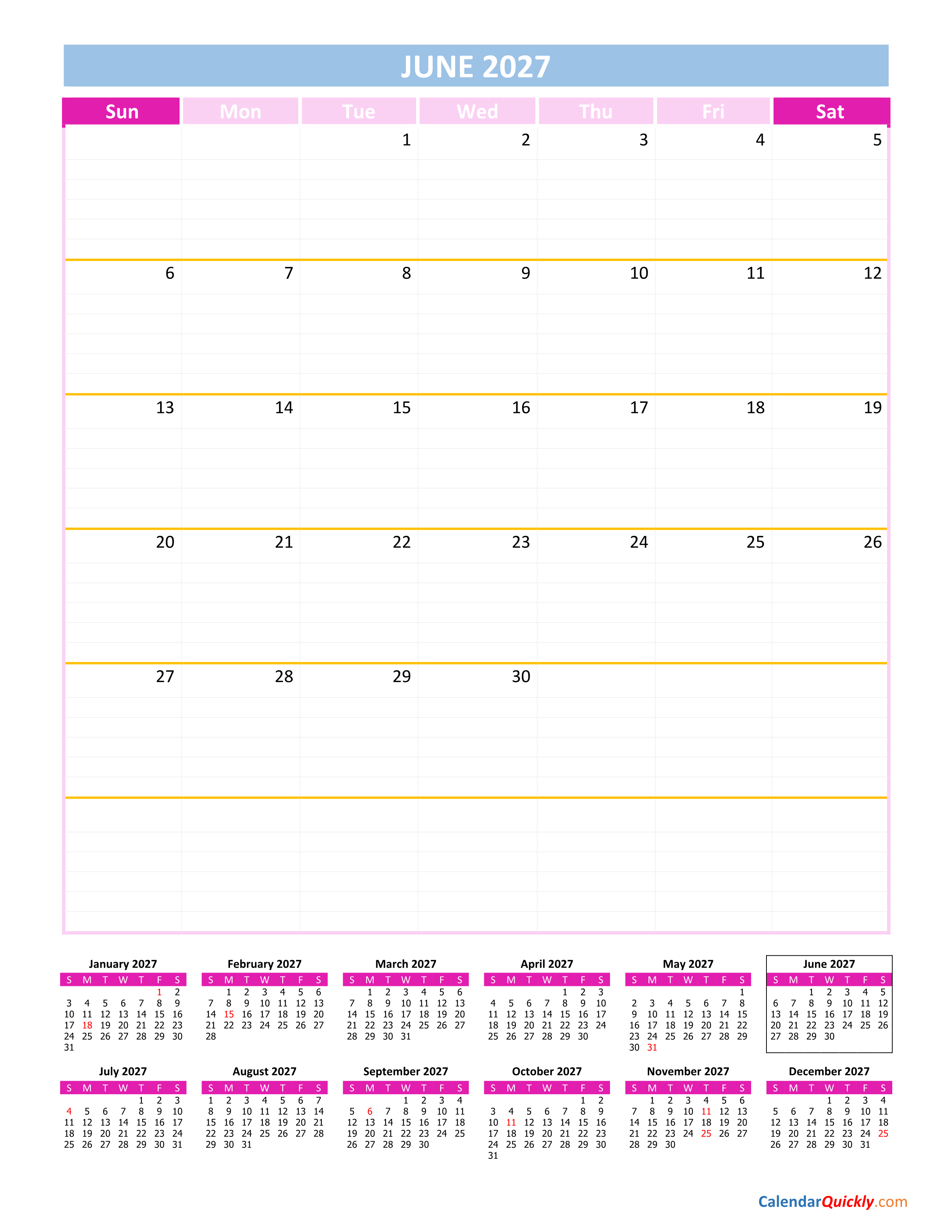 June calendar 2027 is designed in vertical format with many colors. In particular, the footer section has a full 12-month calendar of the year 2027 so you can see the entire day and month of the year. The indispensable part is the space in each day to take notes.
