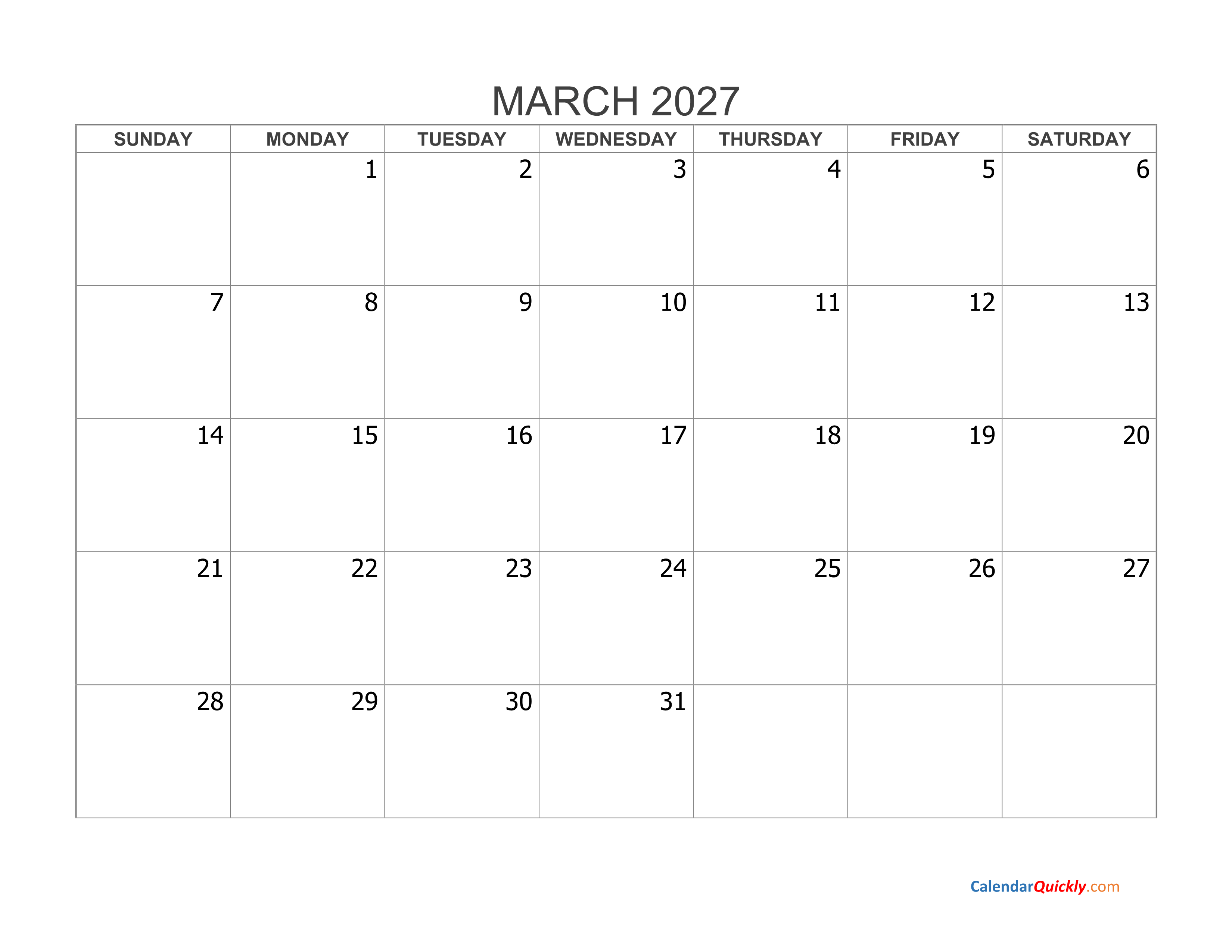 March 2027 blank calendar template is designed in simple, colorless. The holidays of the year are marked in red for easy identification. Every day there is a space for to-do notes. Download march 2027 calendar template for free as a PDF file and use it for your business.
