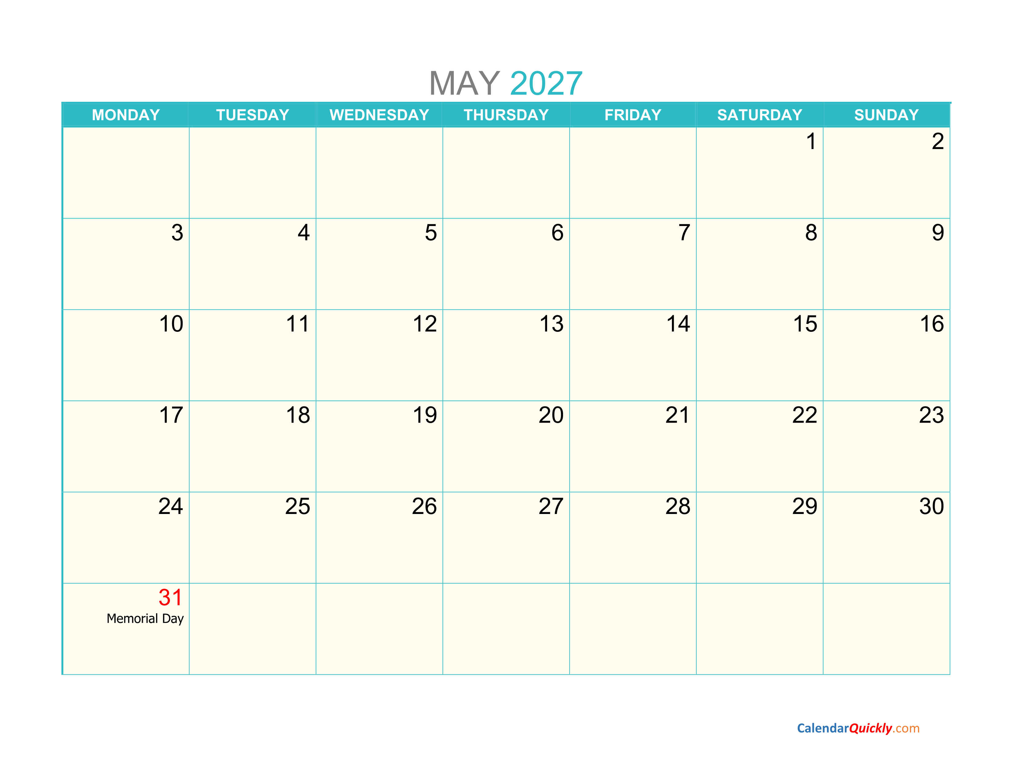 May Monday 2027 Calendar Printable