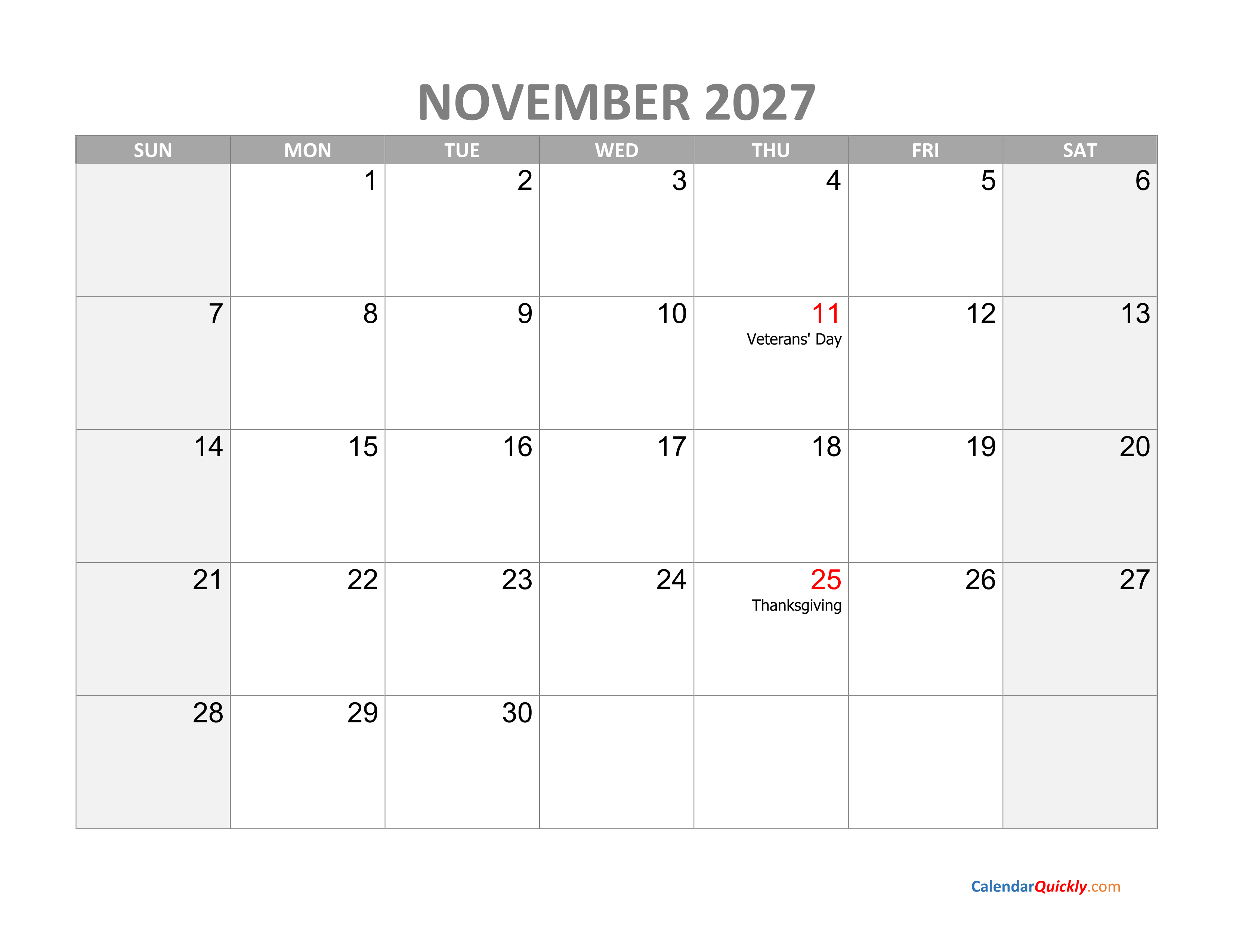 November Calendar 2027 with Holidays