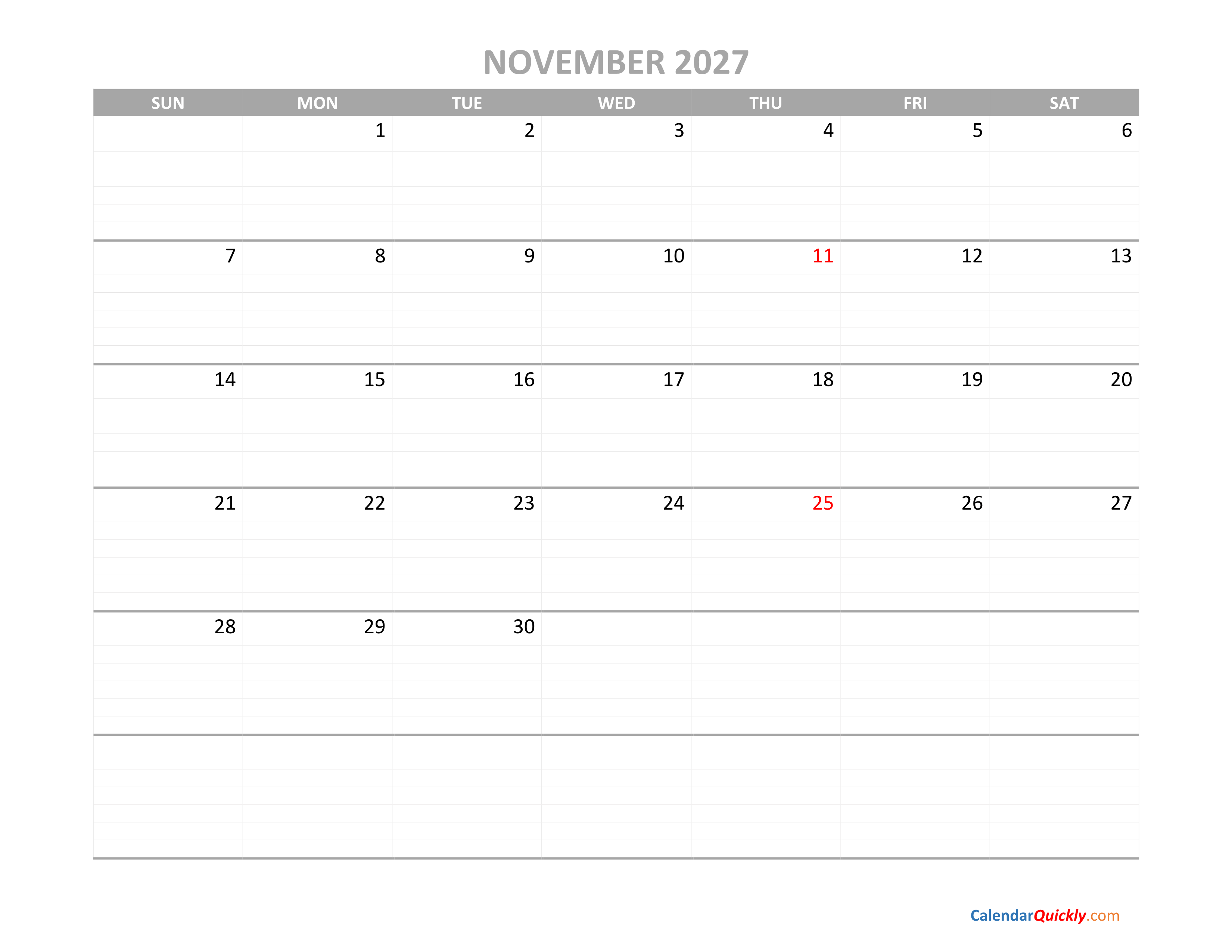 November Calendar 2027 Printable