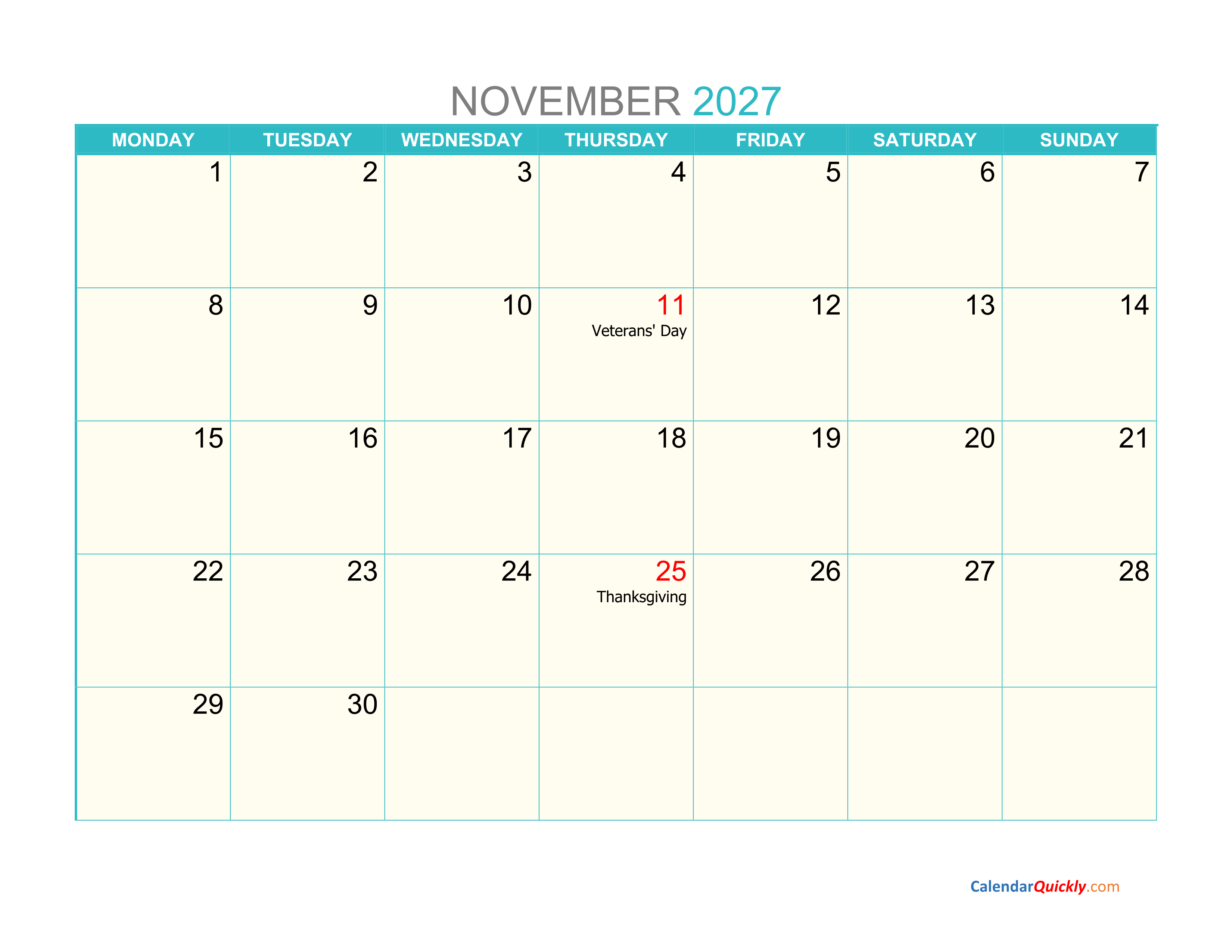 November monday 2027 calendar printable in pale yellow and blue colors makes the calendar page stand out more. US federal holidays are marked in red so it is easy to recognize the appropriate plans. The calendar template is provided for free in PDF format, you can easily download and print.
