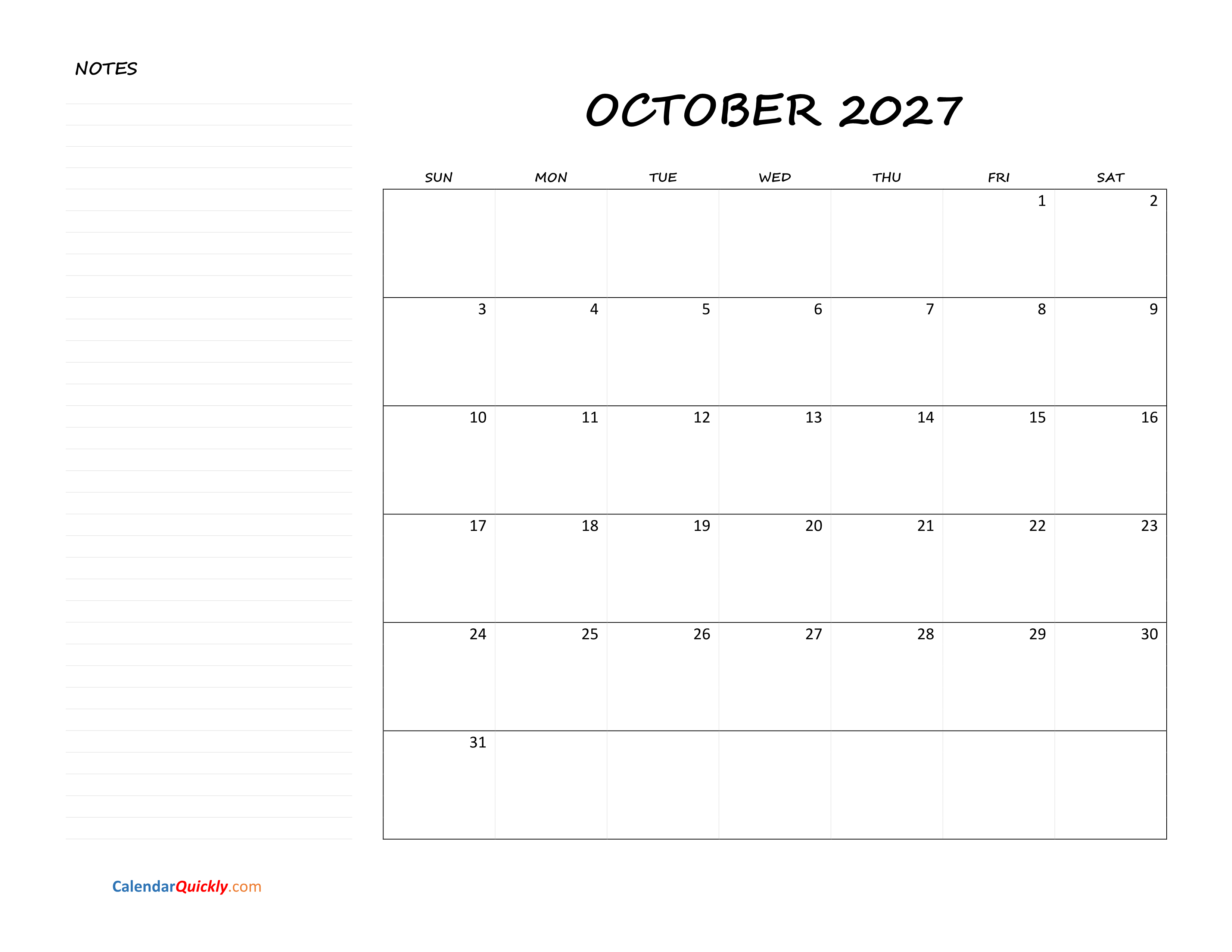 October blank calendar 2027 is designed simply, with the calendar on the right and a space to note the tasks on the left. Blank calendar styles, small fonts, plenty of space for note-taking purposes. The calendar template is provided for free in the PDF file, you can easily download and print.