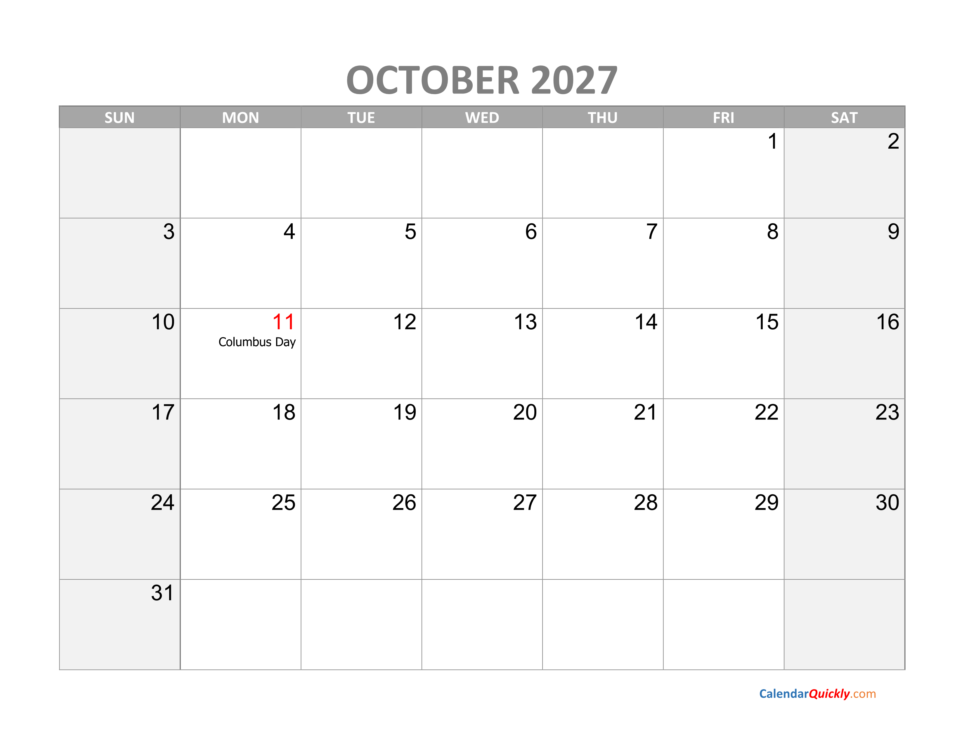 October Calendar 2027 with Holidays