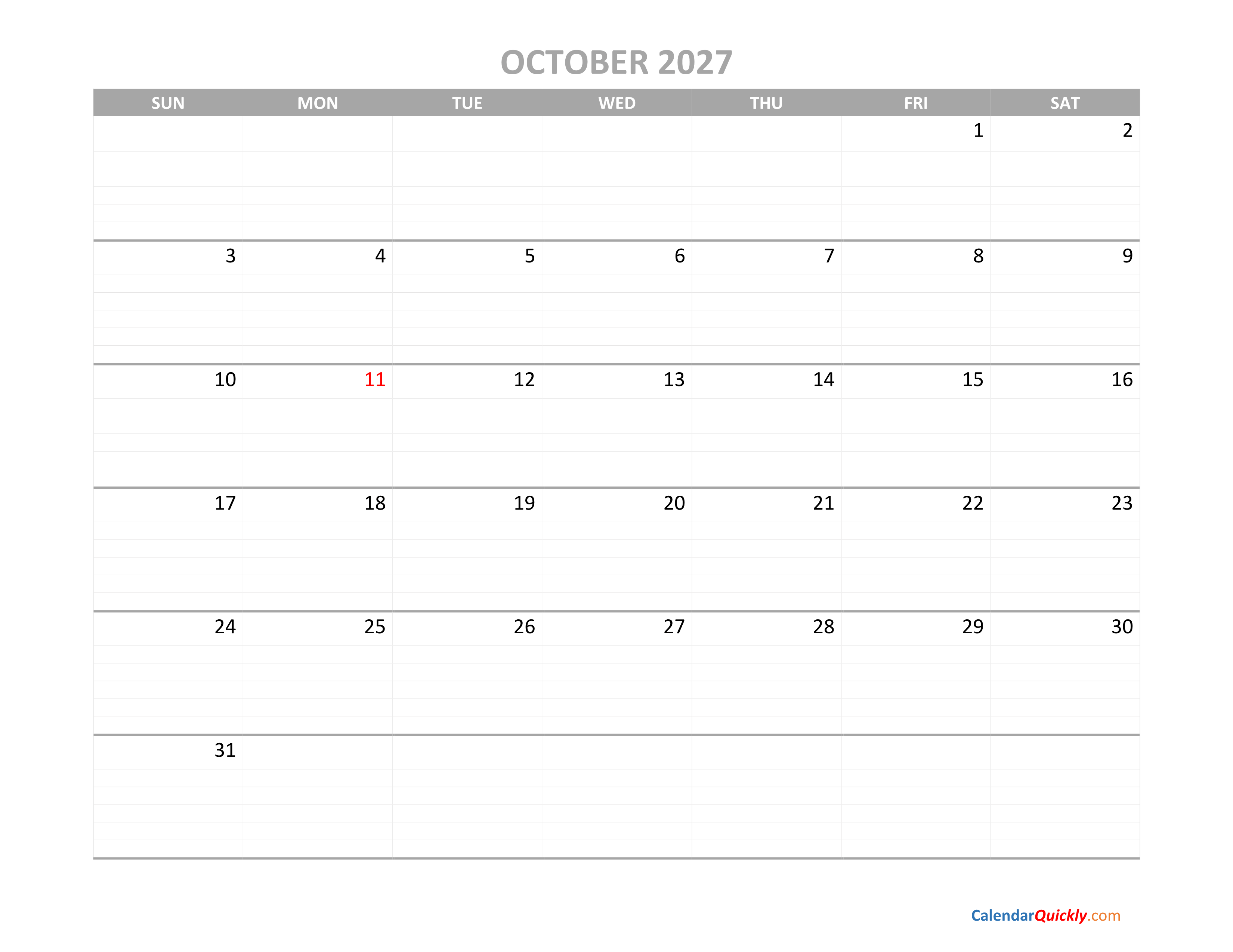 October calendar 2027 printable with a design that clearly separates the weeks of the month. The entire calendar is fully pageed, but there is still plenty of space for each day for notes. This calendar template is free to download and print for personal use.