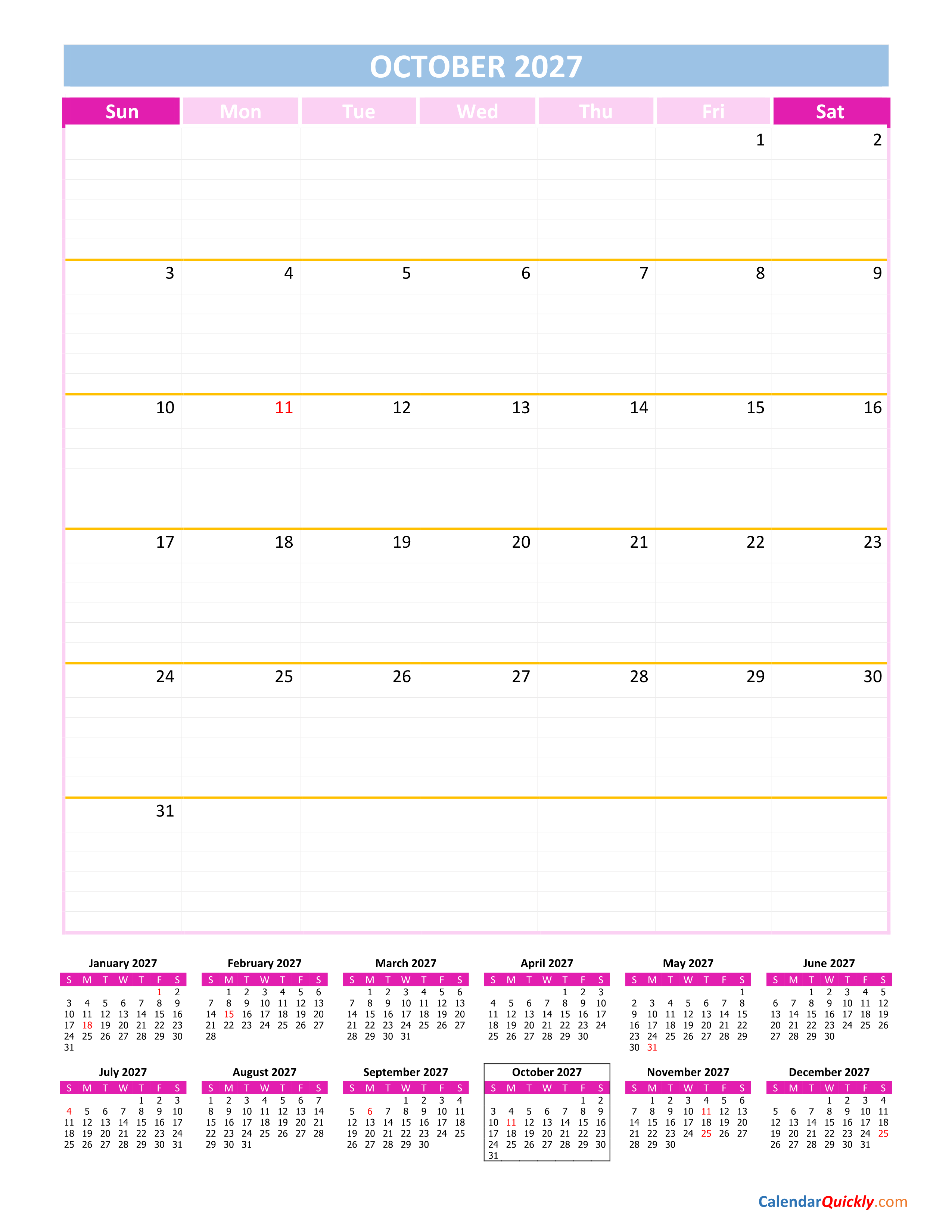 October calendar 2027 is designed in vertical format with many colors. In particular, the footer section has a full 12-month calendar of the year 2027 so you can see the entire day and month of the year. The indispensable part is the space in each day to take notes.