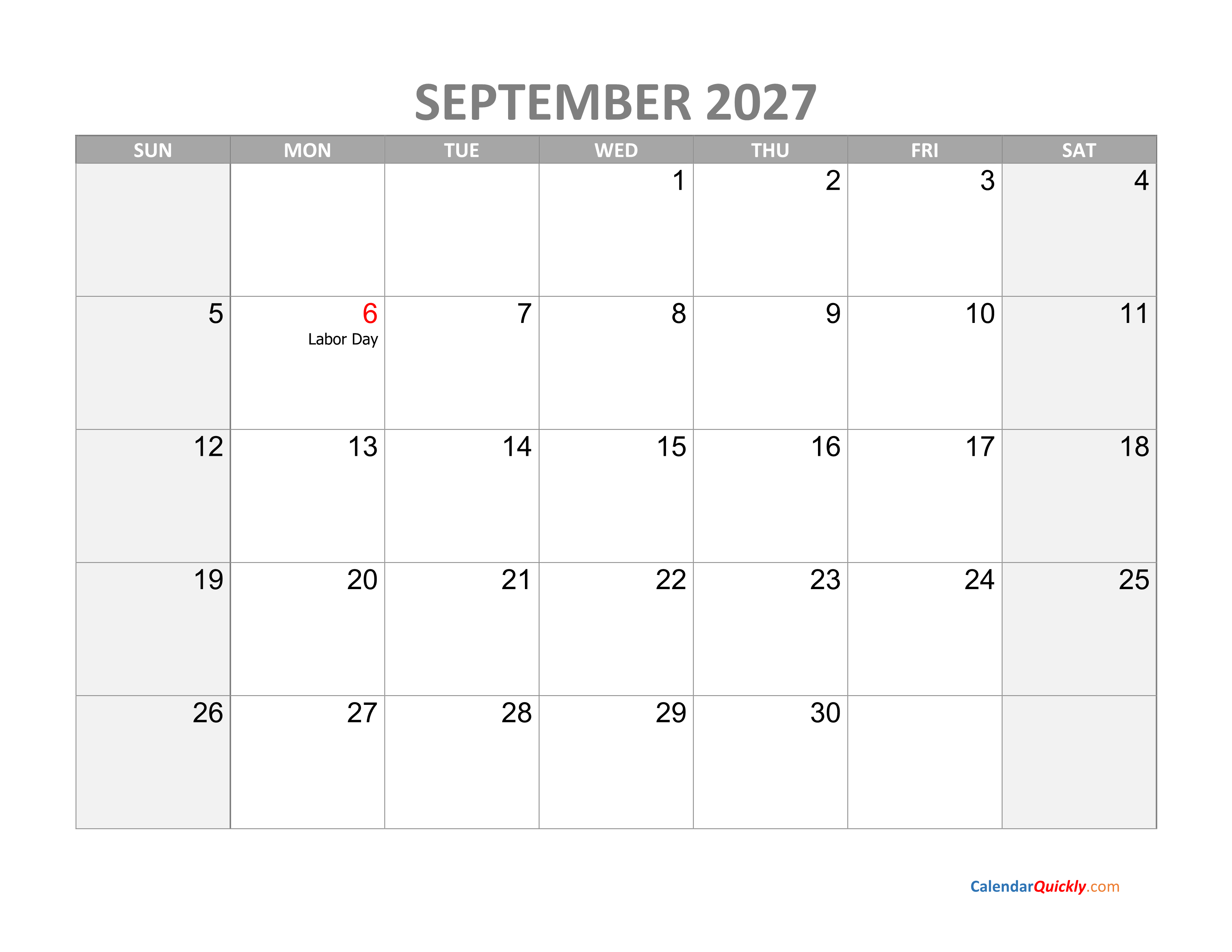 September calendar 2027 with holidays is a classically designed calendar template. The holidays of the year are marked in red for easy identification. The weekends of Saturday and Sunday are marked so that they can be easily seen at a glance.