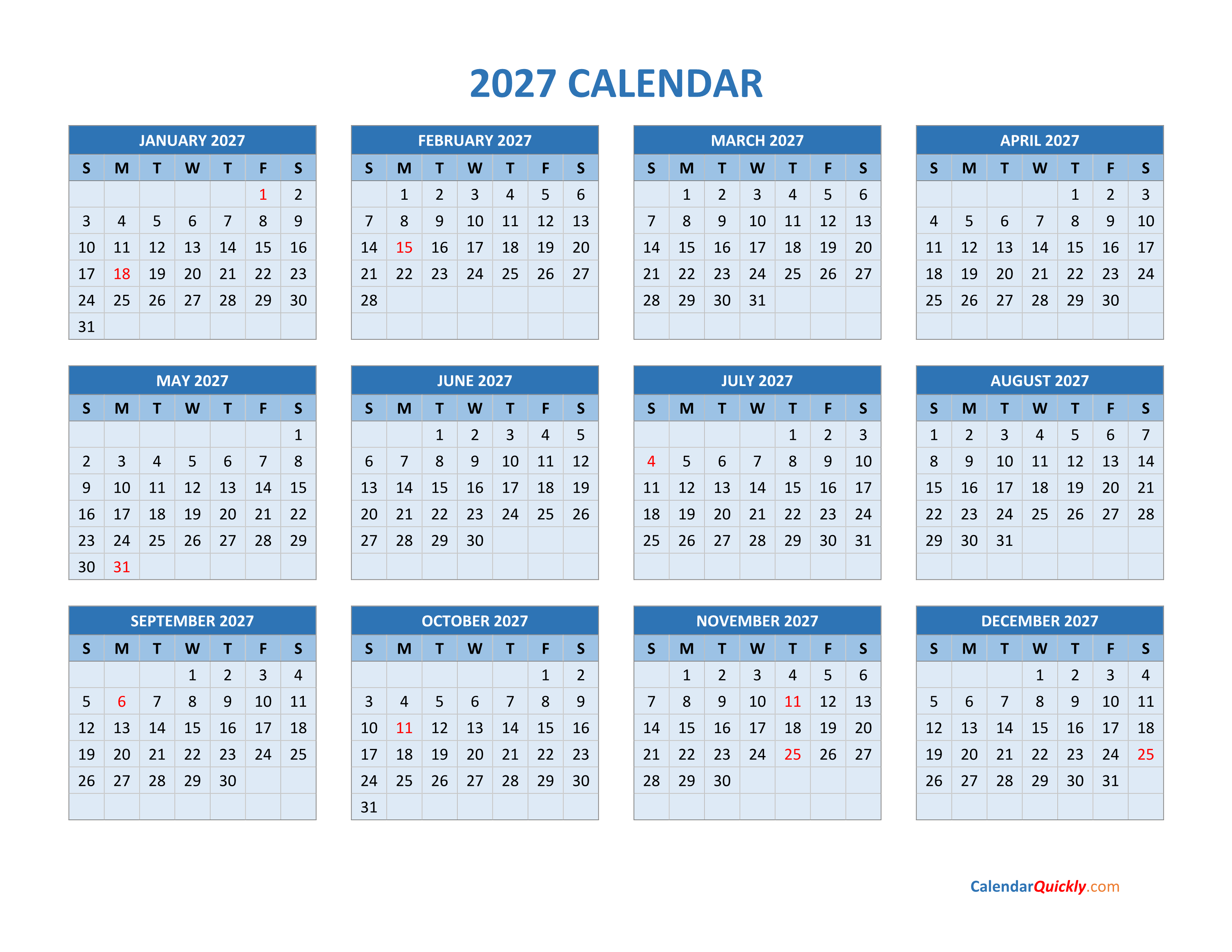 This 2027 calendar template gives you an overview and helps you keep track of the days, weeks and months of the year. The 12 months of year 2027 calendar on a single page, you can easily download it in PDF format.