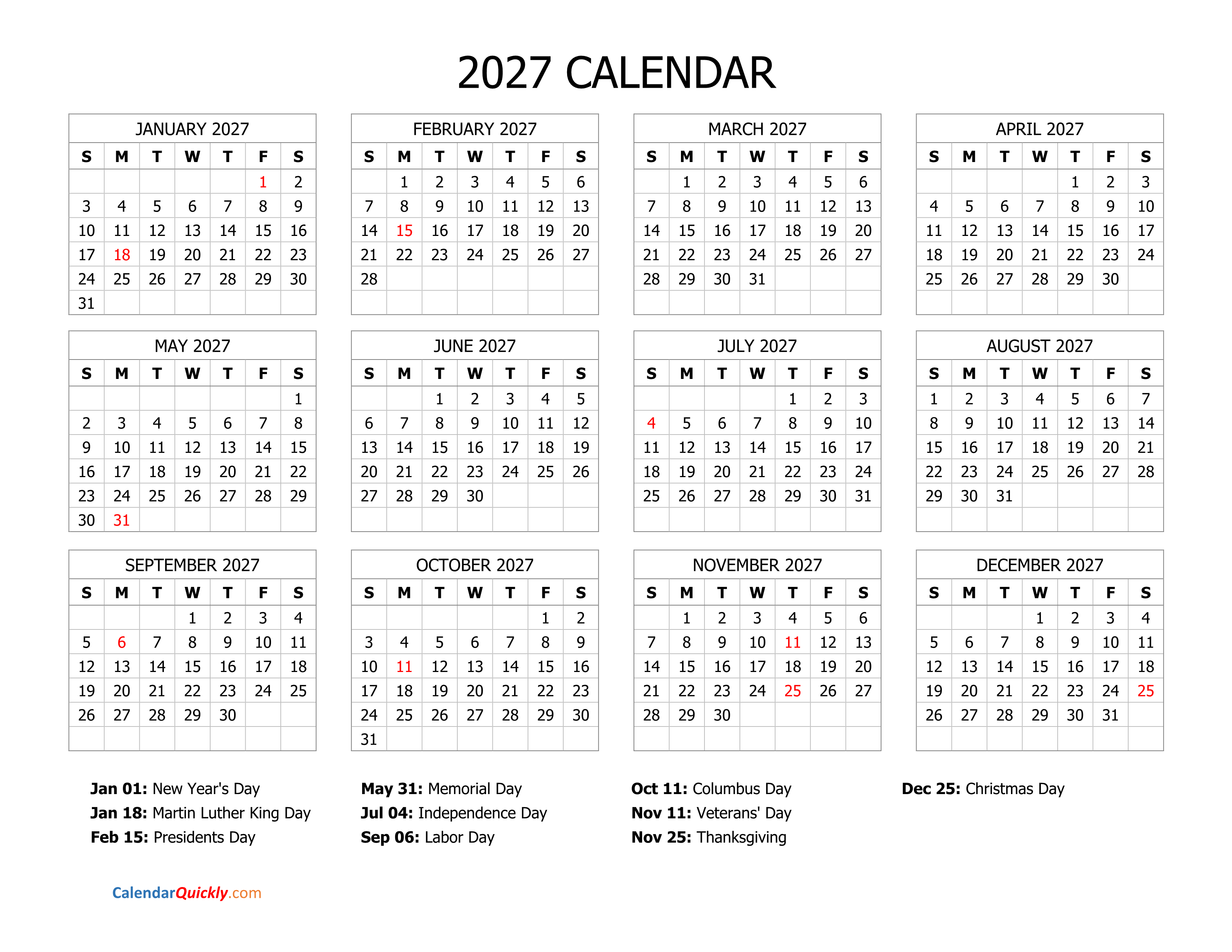 The 2027 calendar template with US federal holidays marked in red makes it easy to observe the holidays of the year. This will help you proactively plan activities for yourself and your family. In addition, this calendar template is also suitable for many other uses: yearly overview, yearly planner, company calendar, holiday planner, trip planner, travel planner, journey planner, office planner...