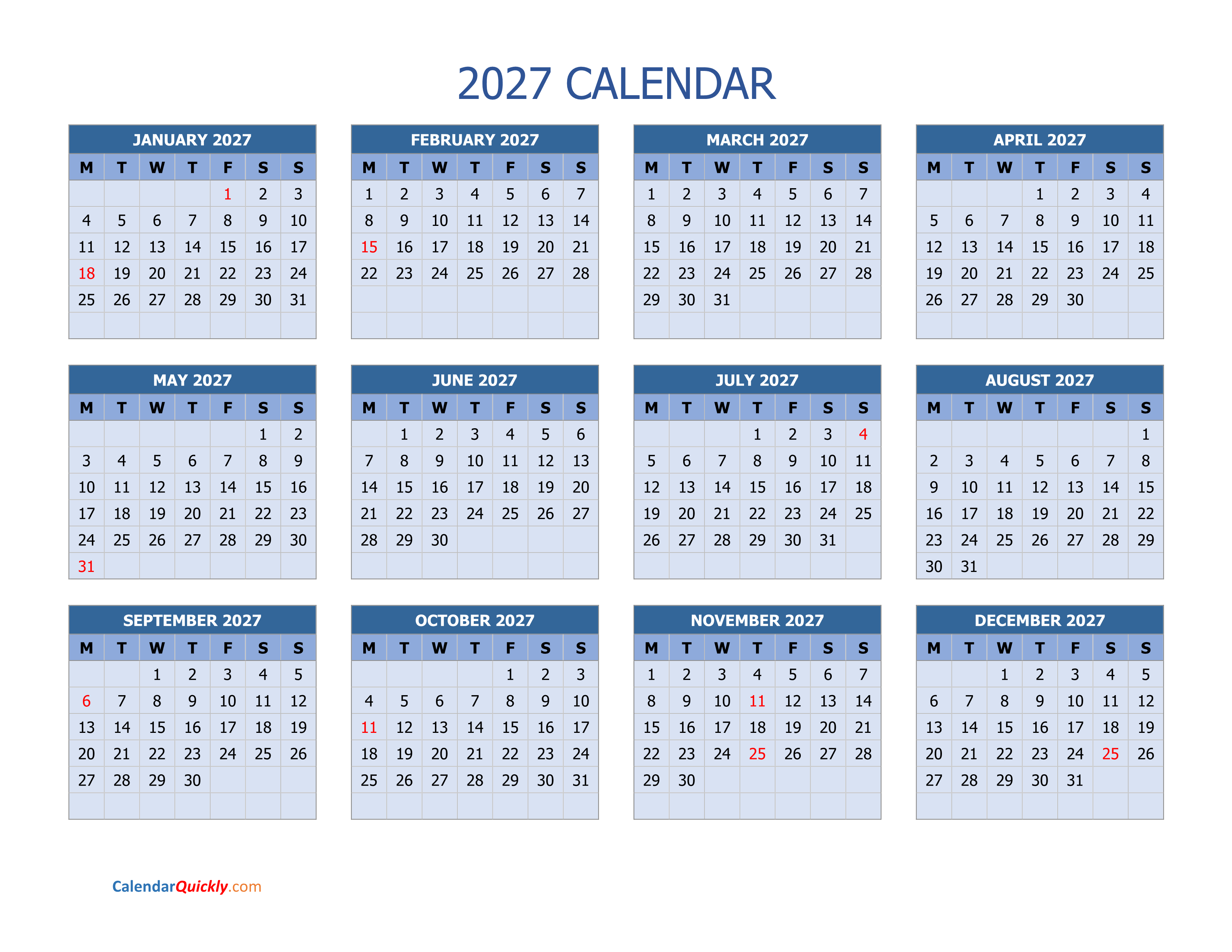 2027 calendar week starts on Monday is designed on horizontal/landscape paper, divided into 4 columns and 3 rows, each row consists of 4 months. Holidays of the year are also highlighted in red for easy identification and plans for these days. Download this 2027 calendar template in PDF format and use it as you wish.