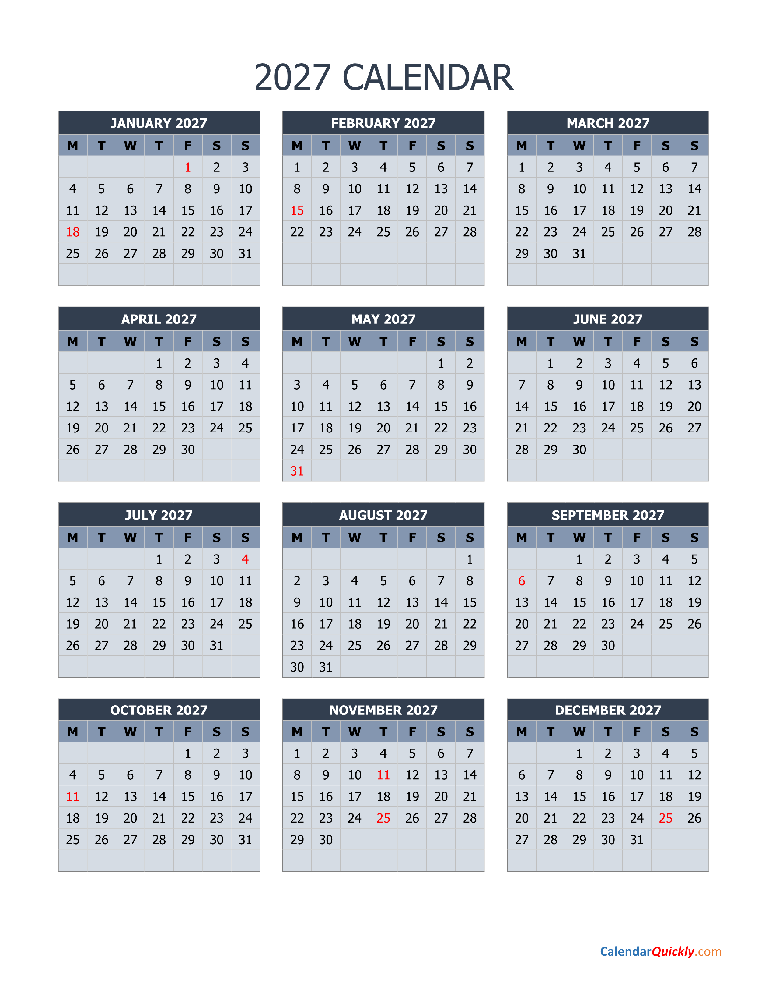 Calendar 2027 week starts on Monday is designed on vertical/portrait paper, divided into 3 columns and 4 rows, each row includes 3 months or a quarter of the year. The holidays of the year are also marked in red, making it easy to observe and actively plan for yourself. We hope our calendar templates will be of great help in your work.